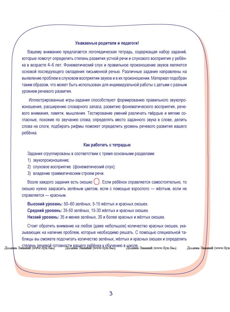 Вашему вниманию предлагается логопедическая тетрадь, содержащая набор заданий, которые помогут определить степень развития устной речи и слухового восприятия у ребёнка в возрасте 4–6 лет. Фонематический слух и правильное произношение звуков являются основой последующего овладения письменной речью.