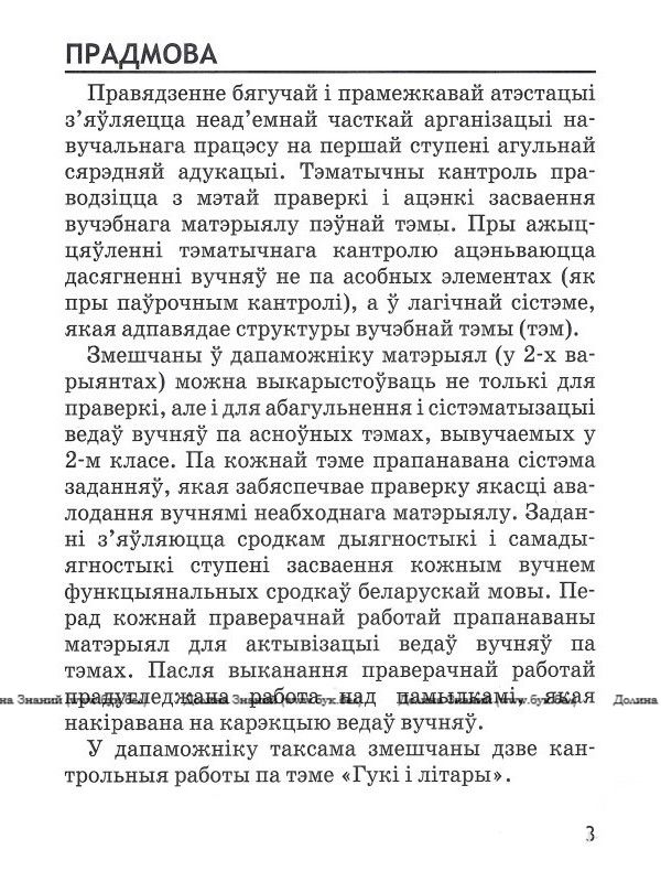Сістаматычны ўлік ведаў, уменняў і навыкаў вучняў з’яўляецца неад’емнай часткай арганізацыі навучальнага працэсу ў пачатковай школе. Змешчаны ў дапаможніку матэрыял можна выкарыстоўваць не толькі для ажыццяўлення тэматычныга кантролю за вучэбнымі дасягненнямі вучняў, але і для абагульнення і сістэматызацыі ведаў вучняў па асноўных тэмах, вывучаемых у 2-м класе. Працаса сшыткам дапамагае арганізаваць індывідуальную работу з вучнямі на ўроку і самастойную работу дома. Для гэтага ў дапаможніку змешчаны адказы, якія можна прагледзець з дапамогай QR-кода.