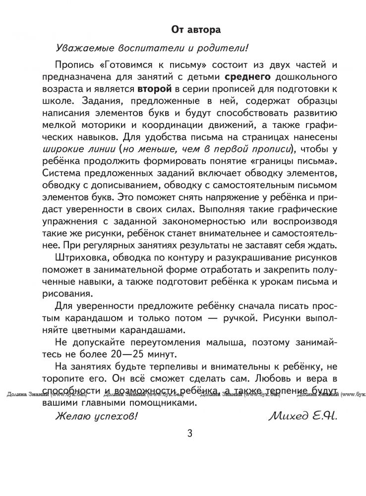 Пособие, предназначенное для занятий с детьми среднего и старшего дошкольного возраста, является вторым в серии прописей для подготовки к школе и содержит специально подобранные задания для развития мелкой мускулатуры пальце как левой, так и правой руки. Выполнение заданий будет способствовать тренировке моторных навыков, а также формированию понятий, «границы письма».