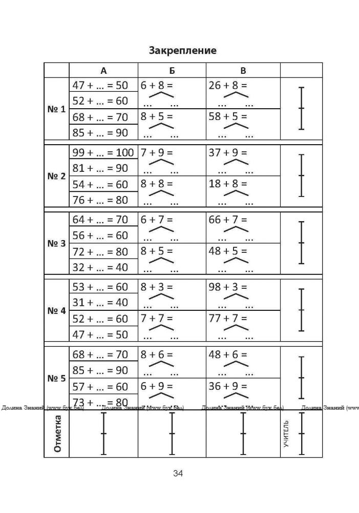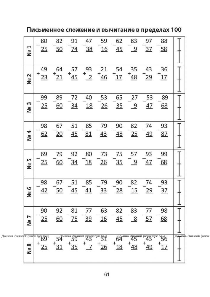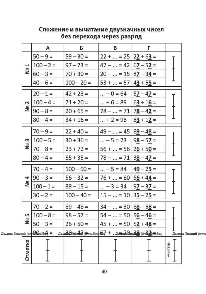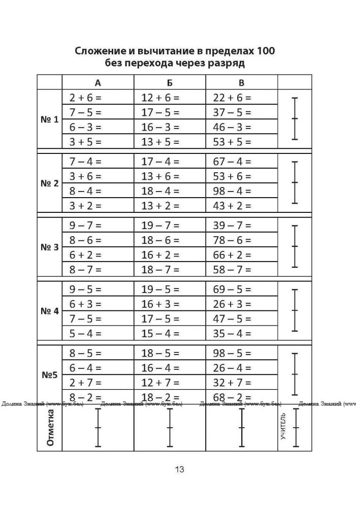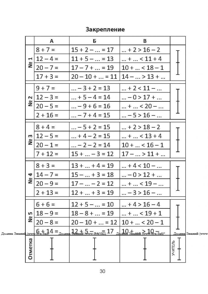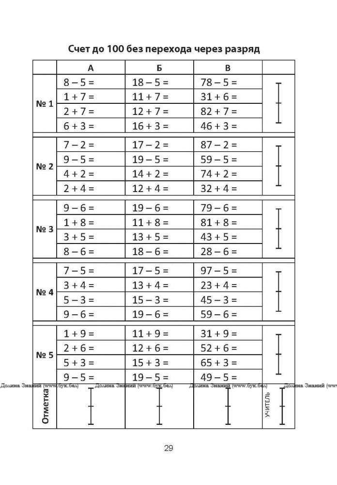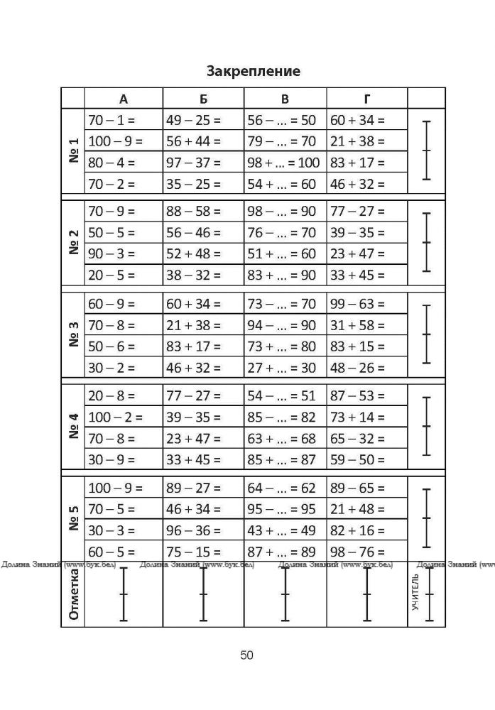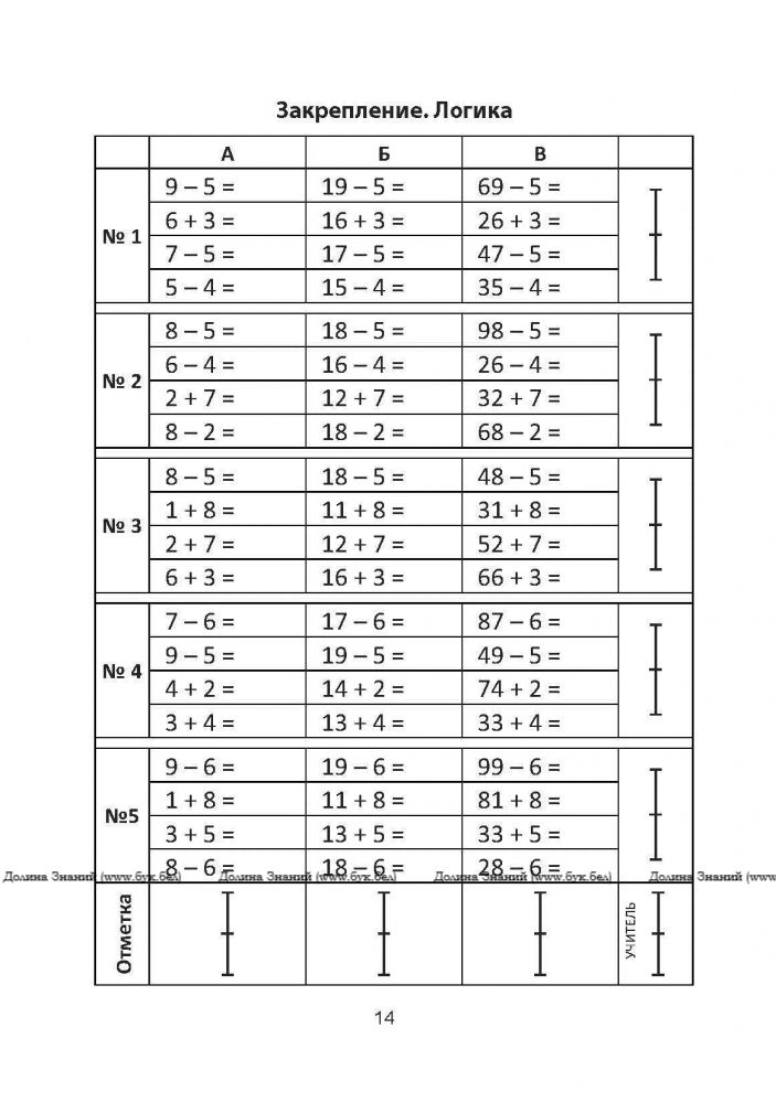 Пособие содержит материал для формирования и автоматизации вычислительных навыков. Представлено в виде таблиц с примерами, выражениями, неравенствами и шкалами для оценивания выполненной работы. Задания можно выполнять как по вертикали (однотипные задания), так и по горизонтали (разноуровневые задания).Тренажер может быть использован как дополнительный материал для отработки и закрепления навыков счета, при организации индивидуальной и групповой работы и во внеурочной деятельности. Адресуется учащимся 2-х классов.