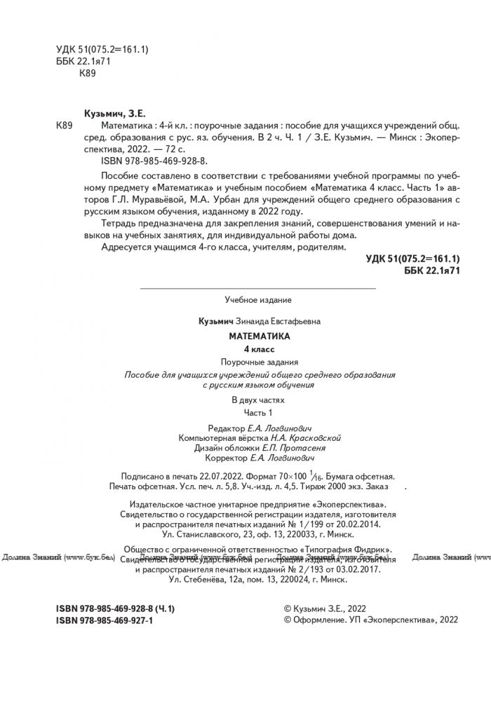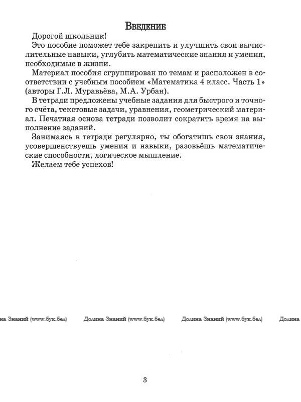 Пособие составлено в соответствии с требованиями учебной программы по учебному предмету «Математика» и учебным пособием «Математика. 4 класс. Часть 1» авторов Г.Л. Муравьёвой, М.А. Урбан для учреждений общего среднего образования с русским языком обучения, изданным в 2022 году. Тетрадь предназначена для закрепления знаний, совершенствования умений и навыков на учебных занятиях, для индивидуальной работы дома. Адресуется учащимся 4-го класса, учителям, родителям.
