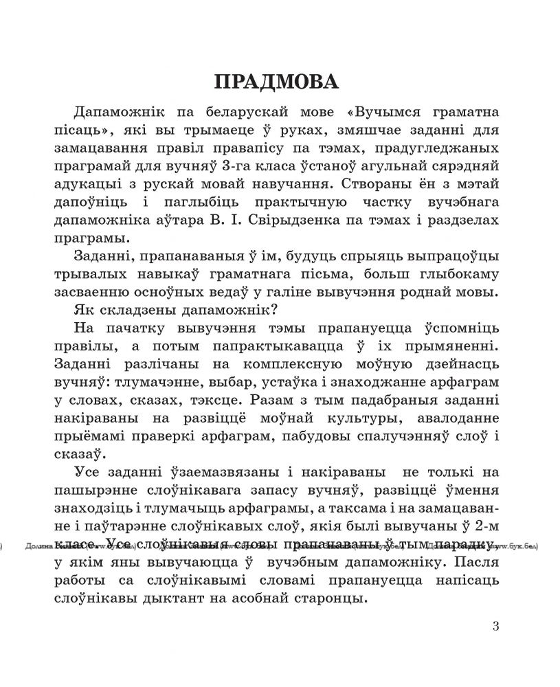 Дапаможнік па беларускай мове падрыхтаваны ў адпаведнасці з патрабаваннямі вучэбнай праграмы. У ім прапанаваны практыкаванні і заданні па асноўных арфаграмах беларускай мовы, якія вывучаюцца ў 3-м класе.Адрасуецца вучням і бацькам.