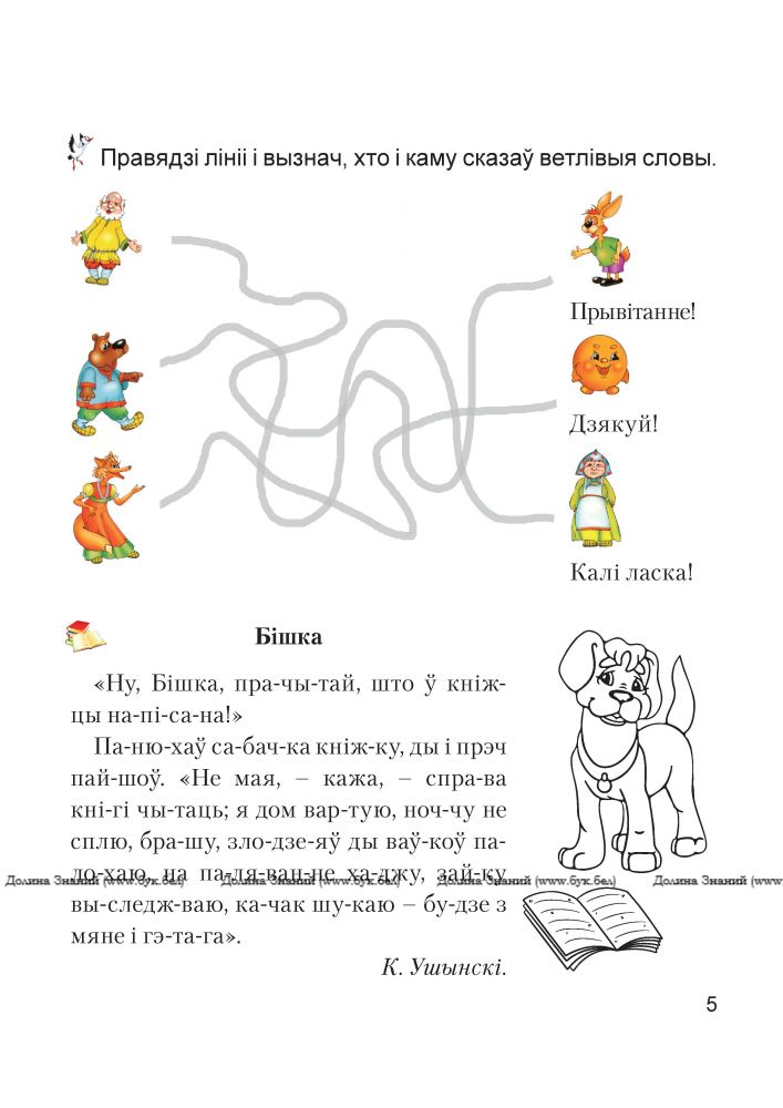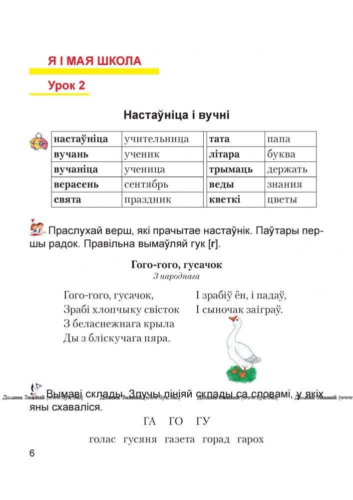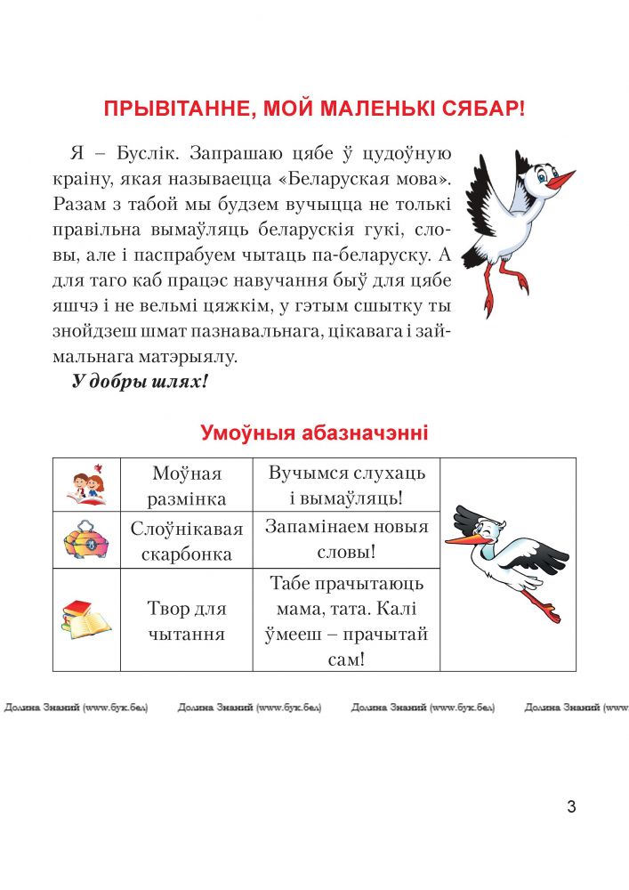 Матэрыял накіраваны на развіццё фанематычнага слыху, слыхавой памяці; фарміраванне уменняў асэнсавана ўспрымаць беларускае маўленне на слых; знаёмства з актуальнай лексікай па змесце праслуханых твораў; паступовае фарміраванне першапачатковага навыку чытання па-беларуску.