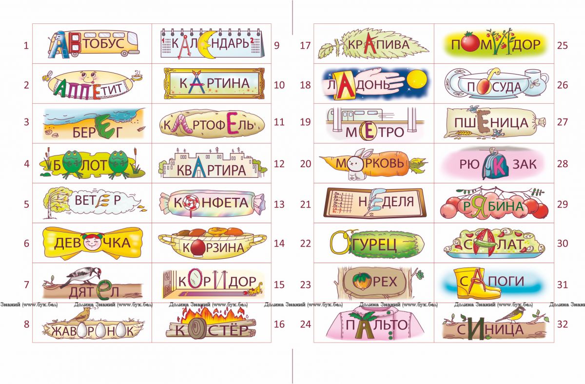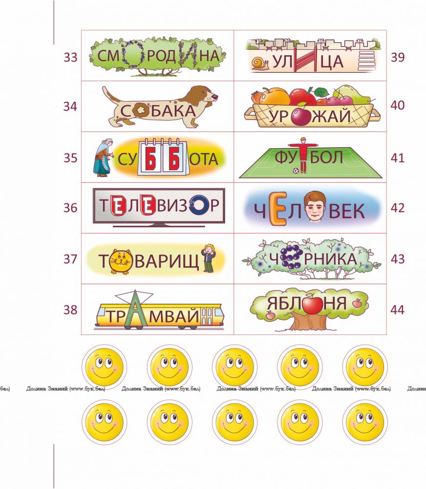 - цветные наклейки с графическими ассоциациями и цветные ребусы ко всем словам;
