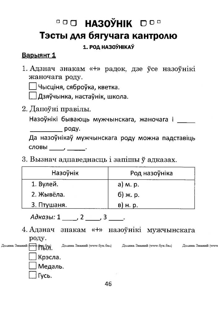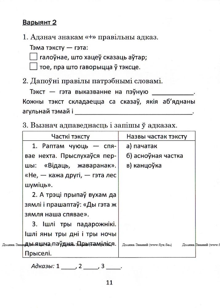 ◆ Тэсты ўключаюць разнастайныя па форме і змесце тэставыя заданні (заданне выбару правільных адказаў з агульнай колькасці прапанаваных, заданне на дапаўненне, заданне на ўстанаўленне адпаведнасці, заданне на ўстанаўленне правільнай паслядоўнасці) для бягучага тэматычнага кантролю па тэмах і раздзелах курса “Беларуская мова” ў 3 класе.
