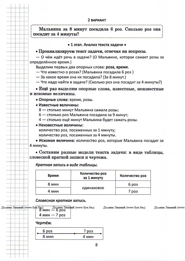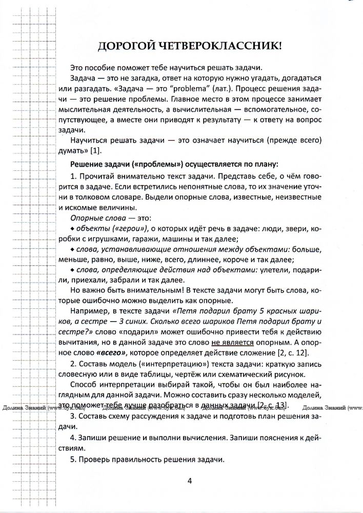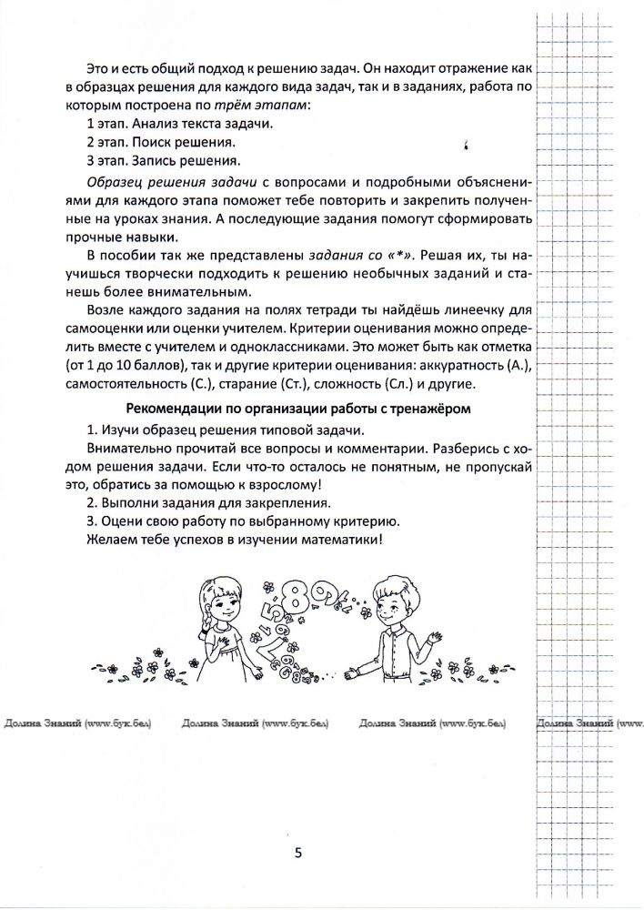 В издании представлена система работы по формированию навыков решения задач, начиная от умения анализировать текст задачи и заканчивая творческими заданиями. Уникальная структура типового элемента отражает последовательность этапов работы над задачей. Образец рассуждения для каждого вида задачи и постепенное усложнение материала в рамках всех этапов работы над задачей направлены на формирование умений анализировать, рассуждать и выбирать план решения задач всех указанных в учебной программе видов, что будет способствовать не только автоматизации, но и формированию осмысленного навыка.
